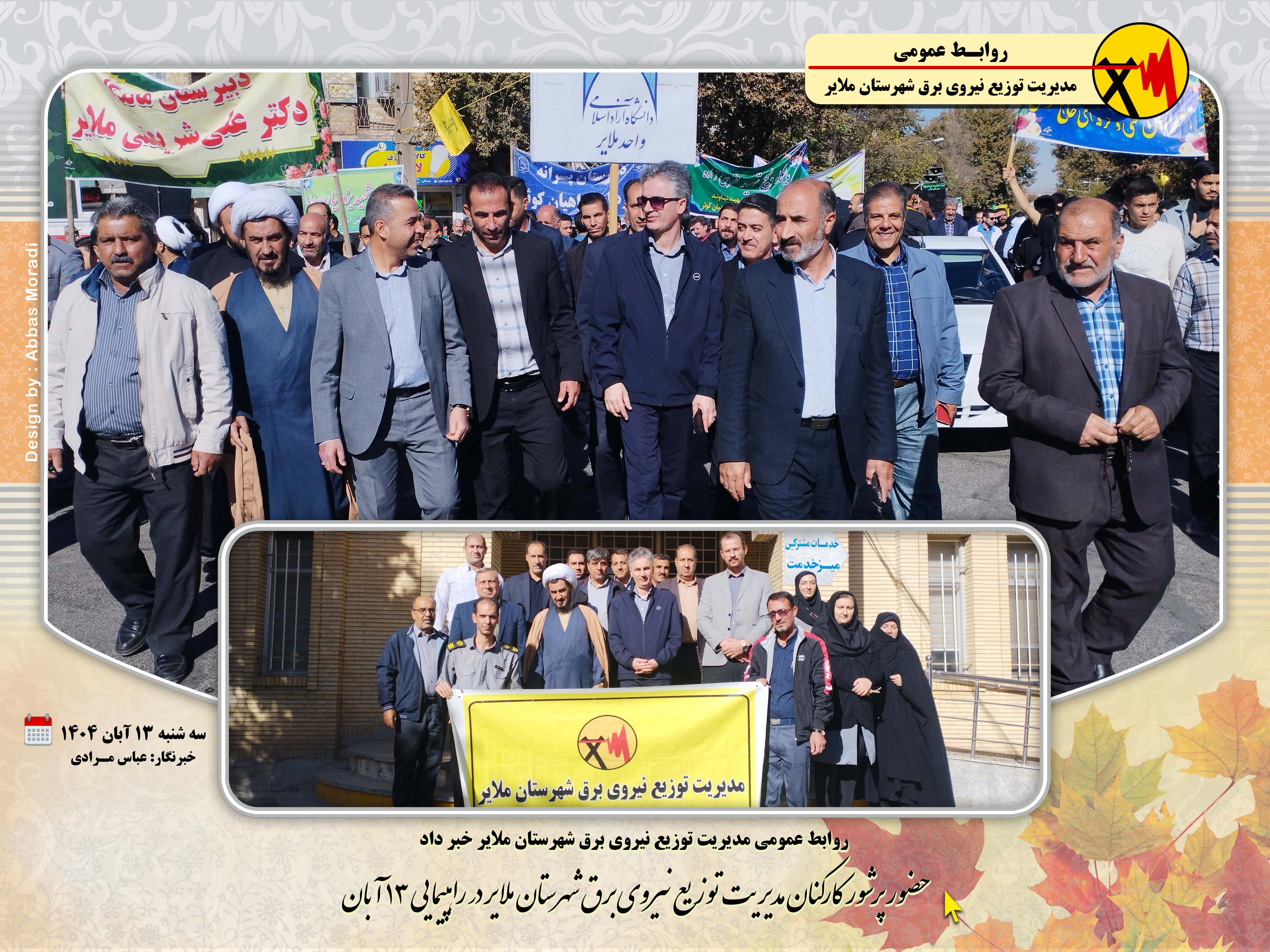 قائم مقام مدیرعامل در توزیع نیروی برق شهرستان ملایر و جمعی از کارکنان این مدیریت همگام با دیگر اقشار مردم ولایتمدار شهرستان ملایر، در راهپیمایی یومالله ۱۳ آبان، روز ملی مبارزه با استکبار جهانی، حضور داشتند. 1404/8/13 23:29:25
