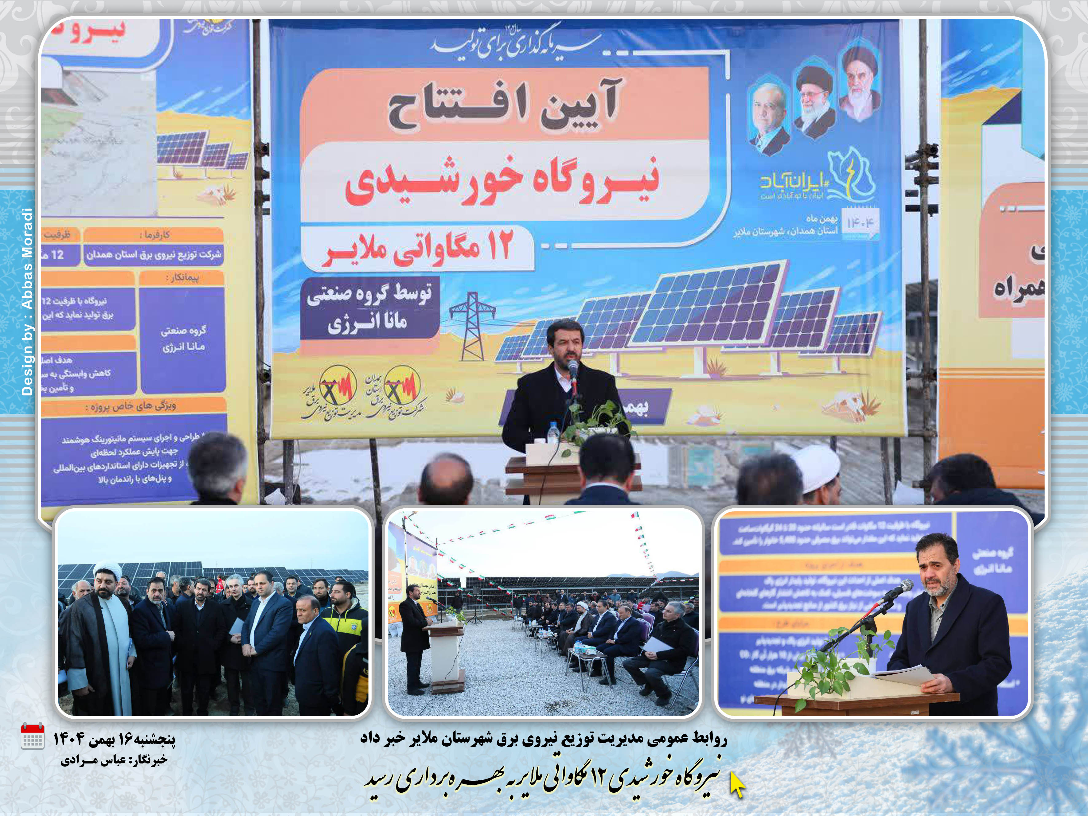 پروژه نیروگاه خورشیدی ۱۲ مگاواتی شهرستان ملایر با حضور استاندار همدان، نمایندگان مردم ملایر در مجلس شورای اسلامی و جمعی از مدیران استانی و شهرستانی به بهرهبرداری رسید.
